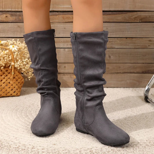 Womens Boots Suede Pleated Flock Fuzzy Low-heeled Boots for Women Solid Color Elegant Mid-Calf Boots