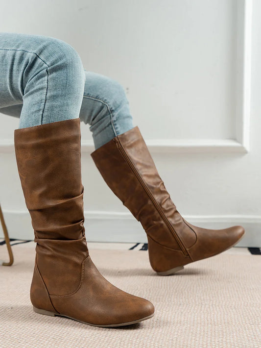 Womens Boots PU Pleated Flock Fuzzy Low-heeled Boots for Women Solid Color Elegant Mid-Calf Boots