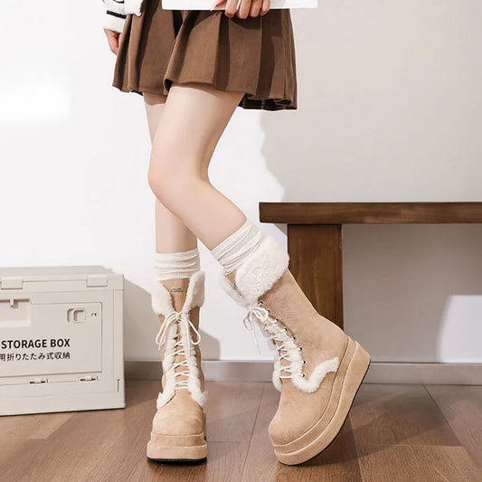 Women Winter Snow Boots - Fuzzy Lace-up Front